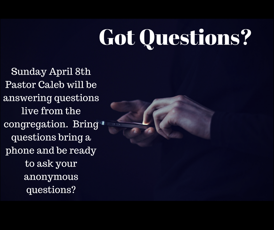Have you ever had a question you wanted to ask in church? Well this week is your chance. Our Pastor will be answering questions that are sent to him live from the congregation. So bring your questions bring your phones and get ready for a unique church experience. You can text question to 423-847-2459 beforehand or live on Sunday.
